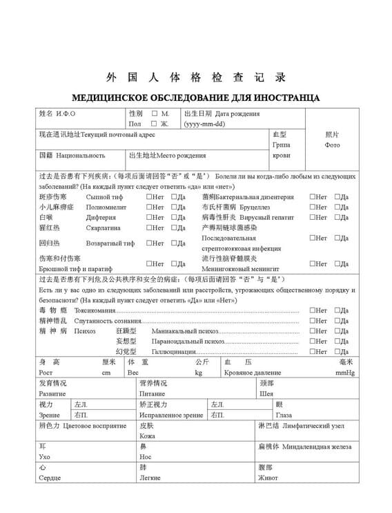 Медицинская справка для посещения КНР формируется на специальном бланке, основной шаблон предоставляется на китайском языке, официальная версия идет на русском и английском. Визуально она напоминает анкету, в которой присутствуют обязательные для заполнения графы, их названия обязательно дублируются на китайском.