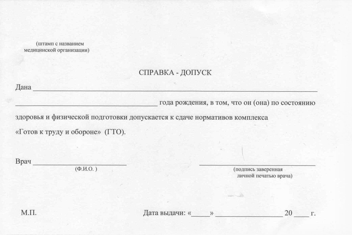 Единой формы для справок ГТО нет. Допуск выписывают на обычном бланке, указывая в нем: