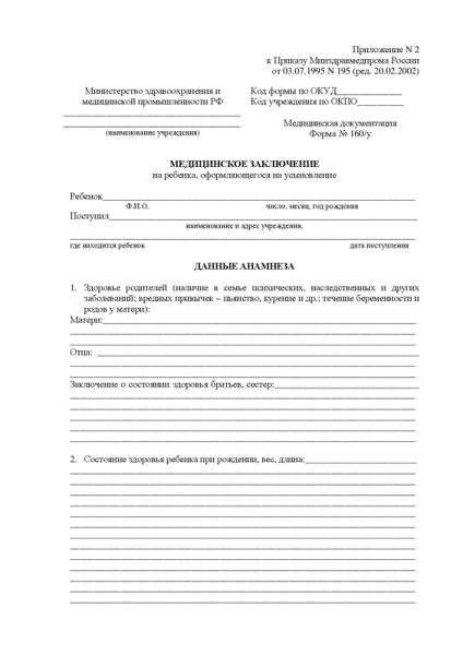 Усыновление несовершеннолетних детей происходит в порядке, установленном законом. Для суда потребуется собрать различные справки, в том числе форму 160/у. Ее выдают после медицинской комиссии. Задача обследования — выявление у ребенка тех патологий, которые могут служить препятствием для его оформления в семью. Врачи экспертной комиссии изучают историю пациента, его медицинскую карту и анализы. На основании предоставленной информации дают заключение об умственном и физическом состоянии.